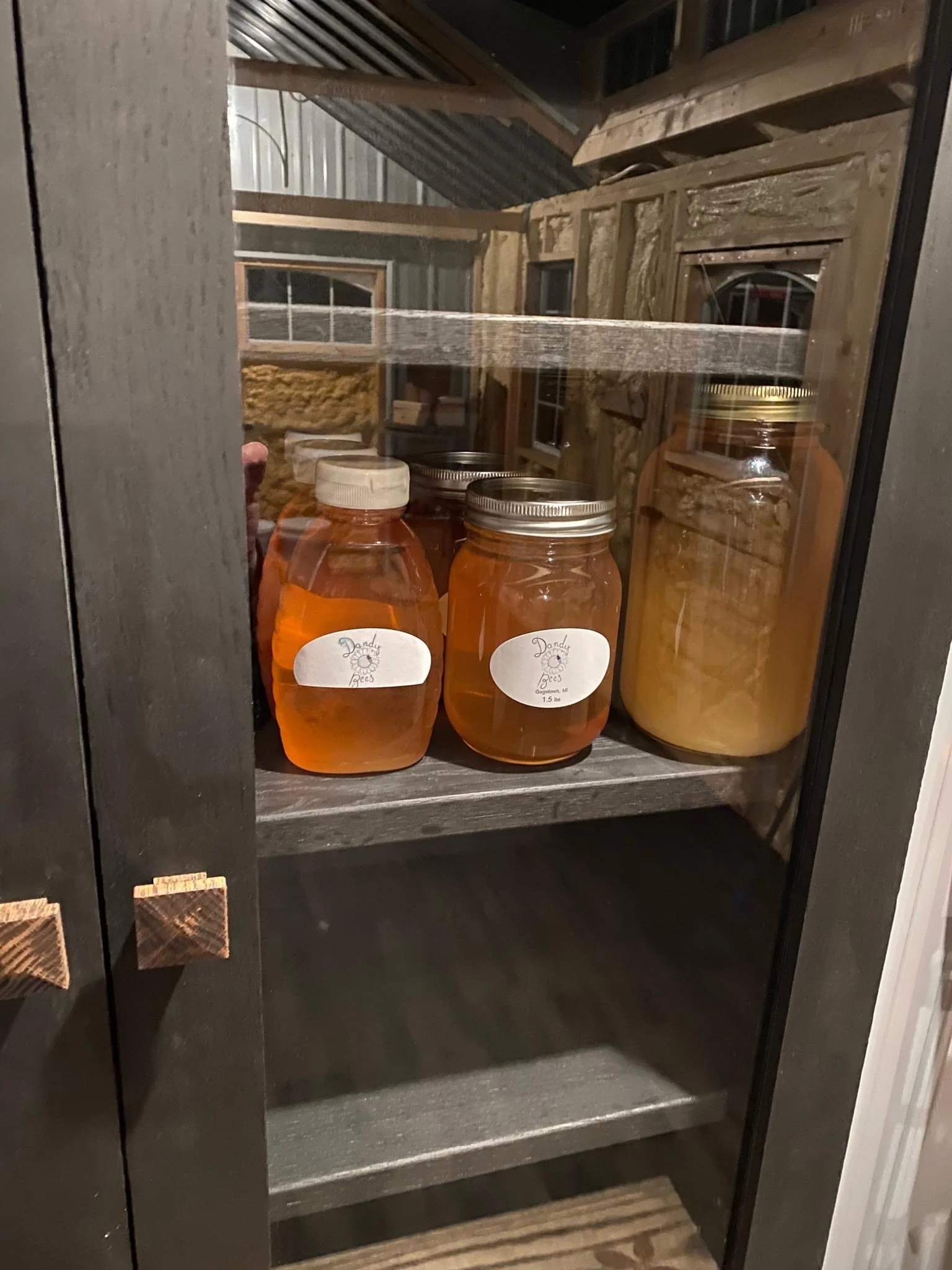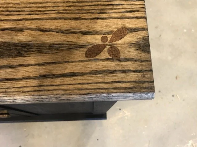 A red oak hutch stained black is just stunning. There are subtle extras everywhere you look on this piece from the hand made pulls to the mahogany bee inlay in the top.
