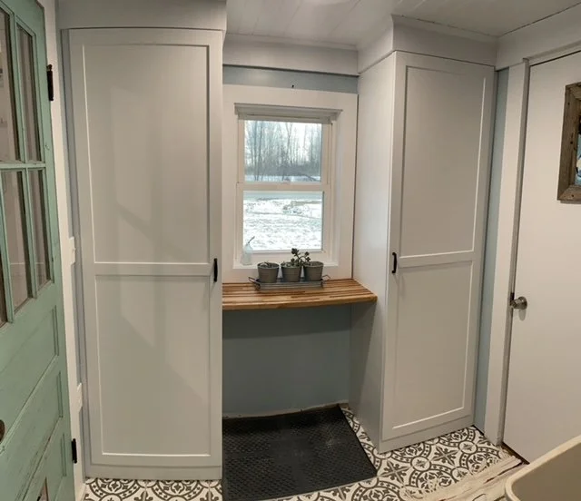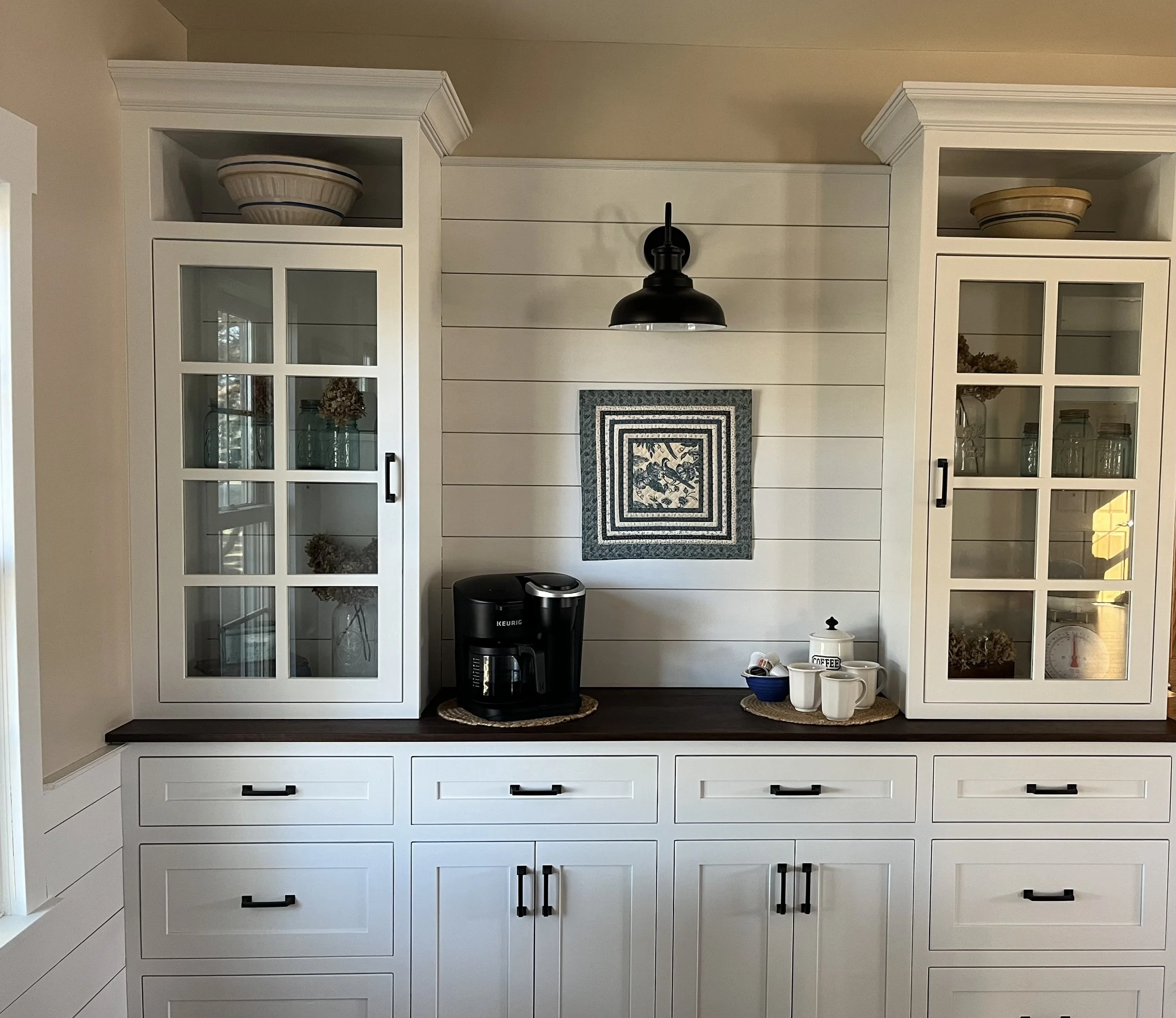 This rolling cabinet with custom butcher block top was the missing piece to this kitchen. It was made to match the existing cabinetry.