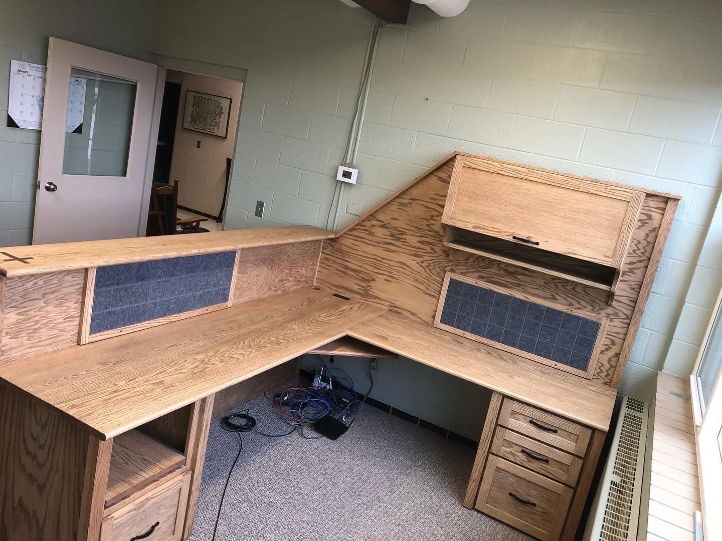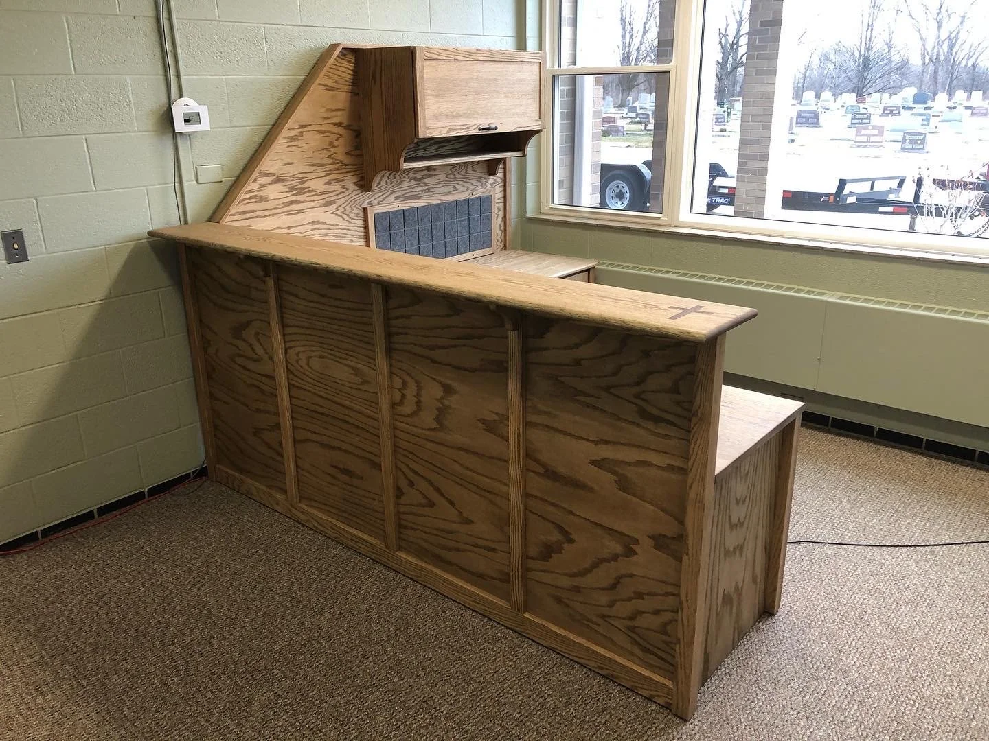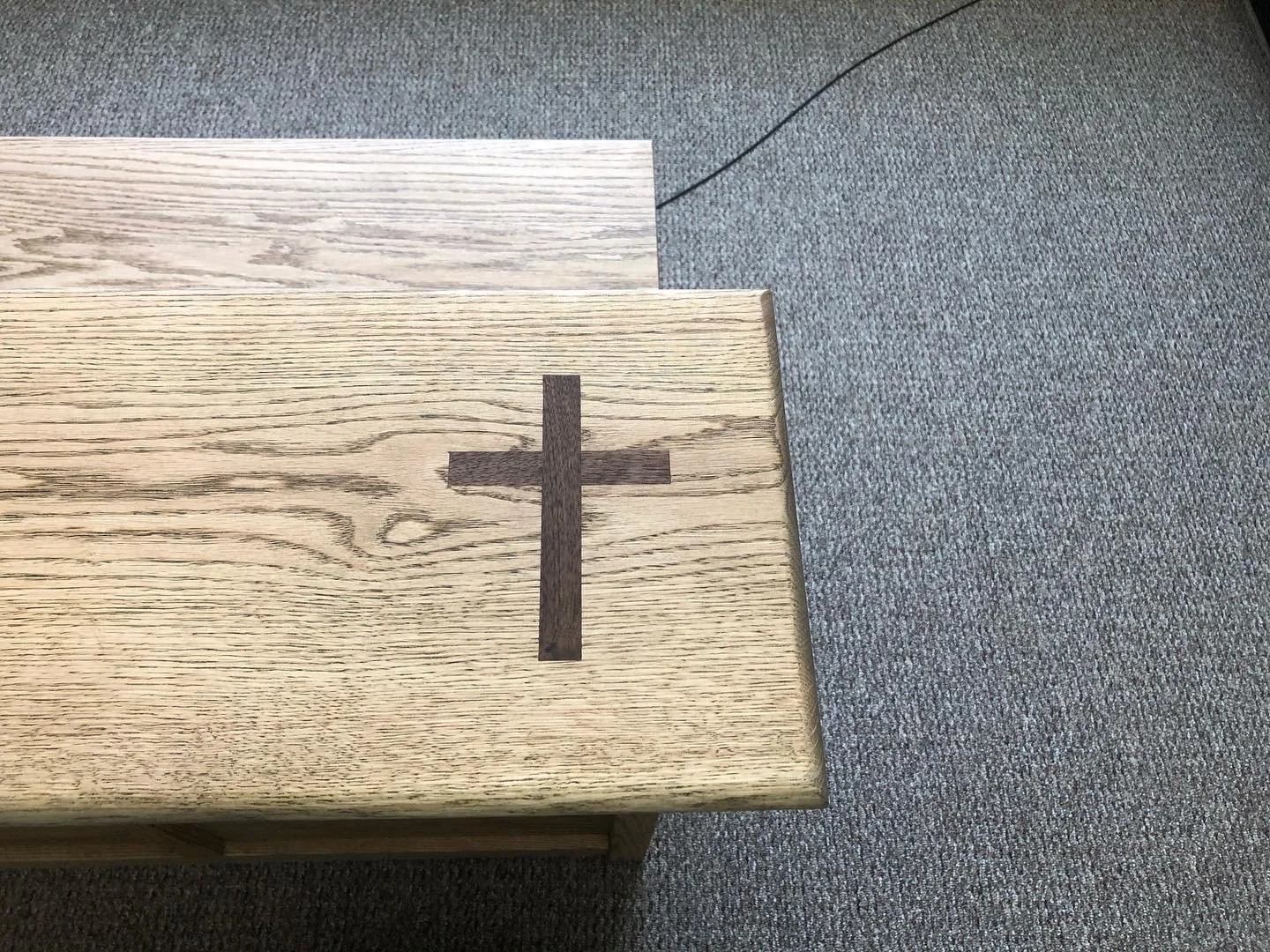 This red oak desk is a great addition to the office. It features a pull out drawer for the printer, a lift up door on the upper cabinet, and an adjustable pull out keyboard tray. There is plenty of storage for all the filing needs. It is finished off with a hand cut walnut cross on the visitors shelf.