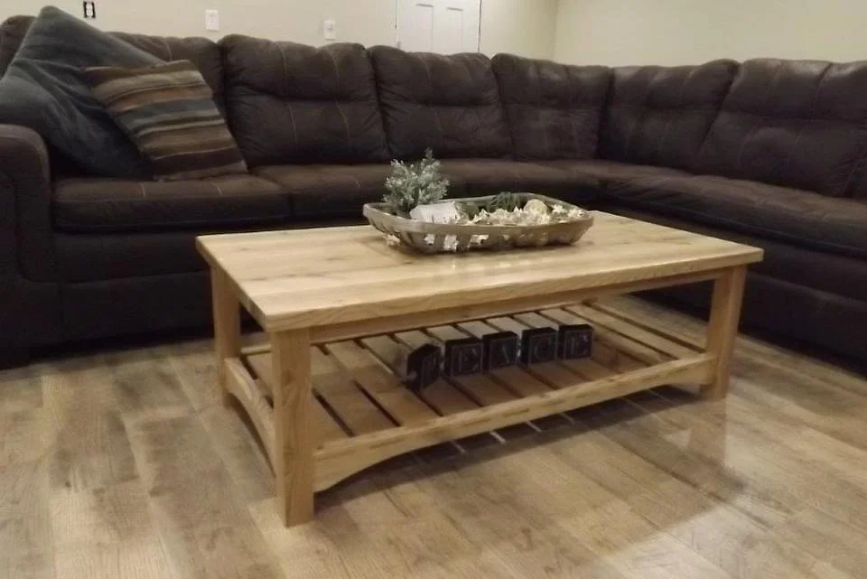 This red oak coffee table is massive. Coming in at 65” long, 32” wide, and 18” tall, it weighs a total of 255 pounds. It is stained a beautiful jet black that still shows off the beautiful grain.