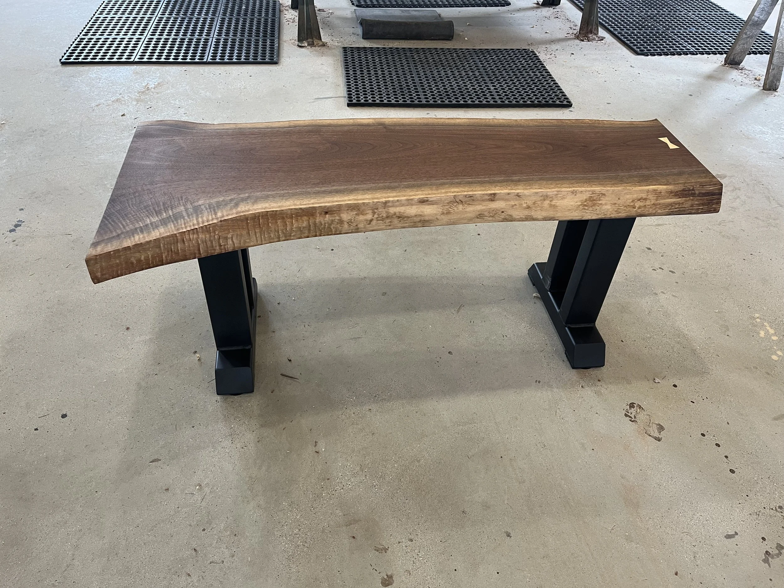 This live edge walnut bench with steel legs and bow tie all compliment each other nicely. The warm feel of the walnut is a beautiful addition to any foyer.