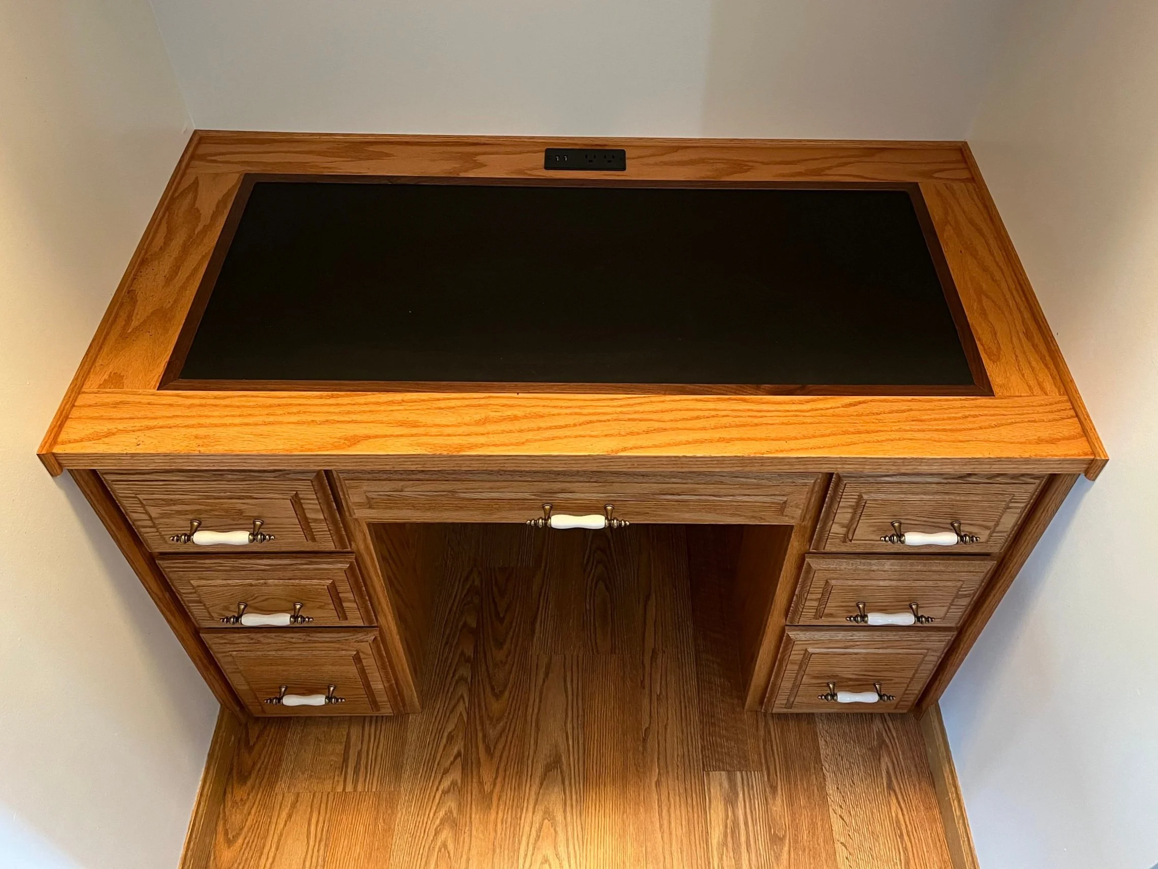This red oak desk features a leather top and walnut inlay. All of the drawers are dovetailed with soft close under mount slides. The exterior matched the existing cabinetry.